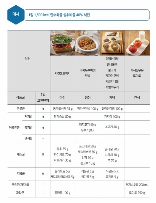 사실 저탄수화물 다이어트 식단으로 철저히 하려해도 비율로는 감이 잘 안옵니다. 실제 체중을 감량을 하려면 평소보다 하루에 500~1,000kcal는 덜 먹어야 성공할 수 있습니다. 대한비만학회에서 제공한 하루 1,500kcal와 2,000kcal로 먹는 사람이 실천 가능한 저탄수화물 식단 참고하시면 좋을것 같습니다.